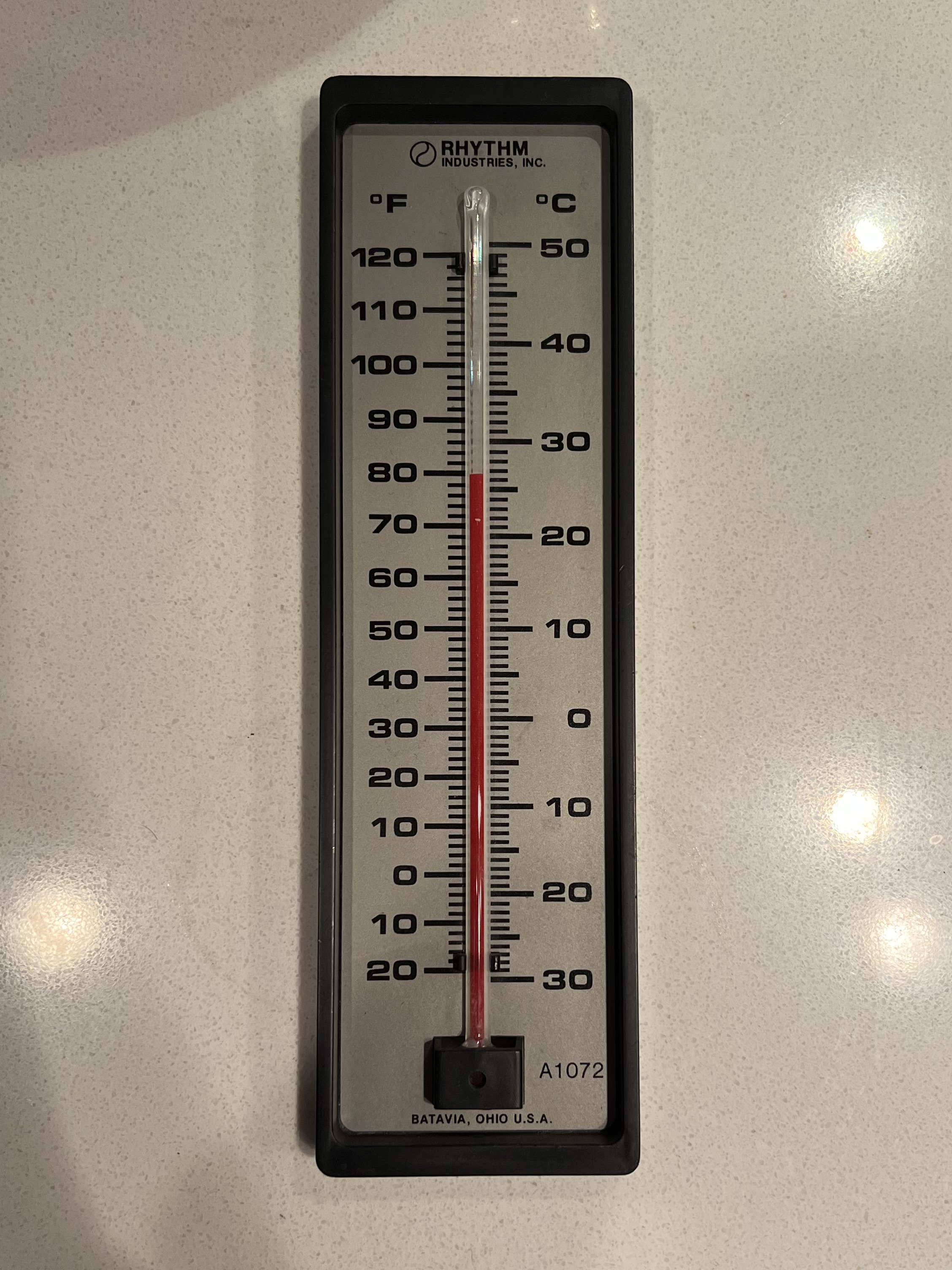 | Type | Wall-mounted liquid-in-glass thermometer marked A1072. |
