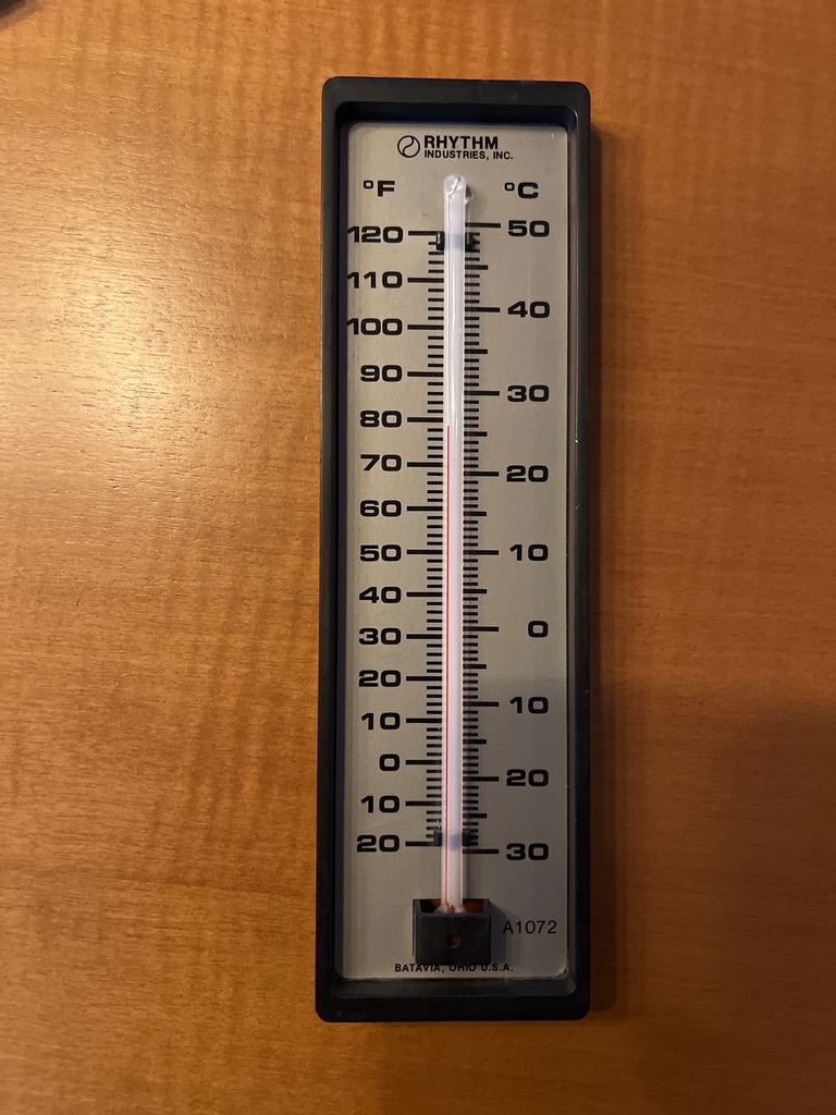 Wall-mounted liquid-in-glass thermometer.